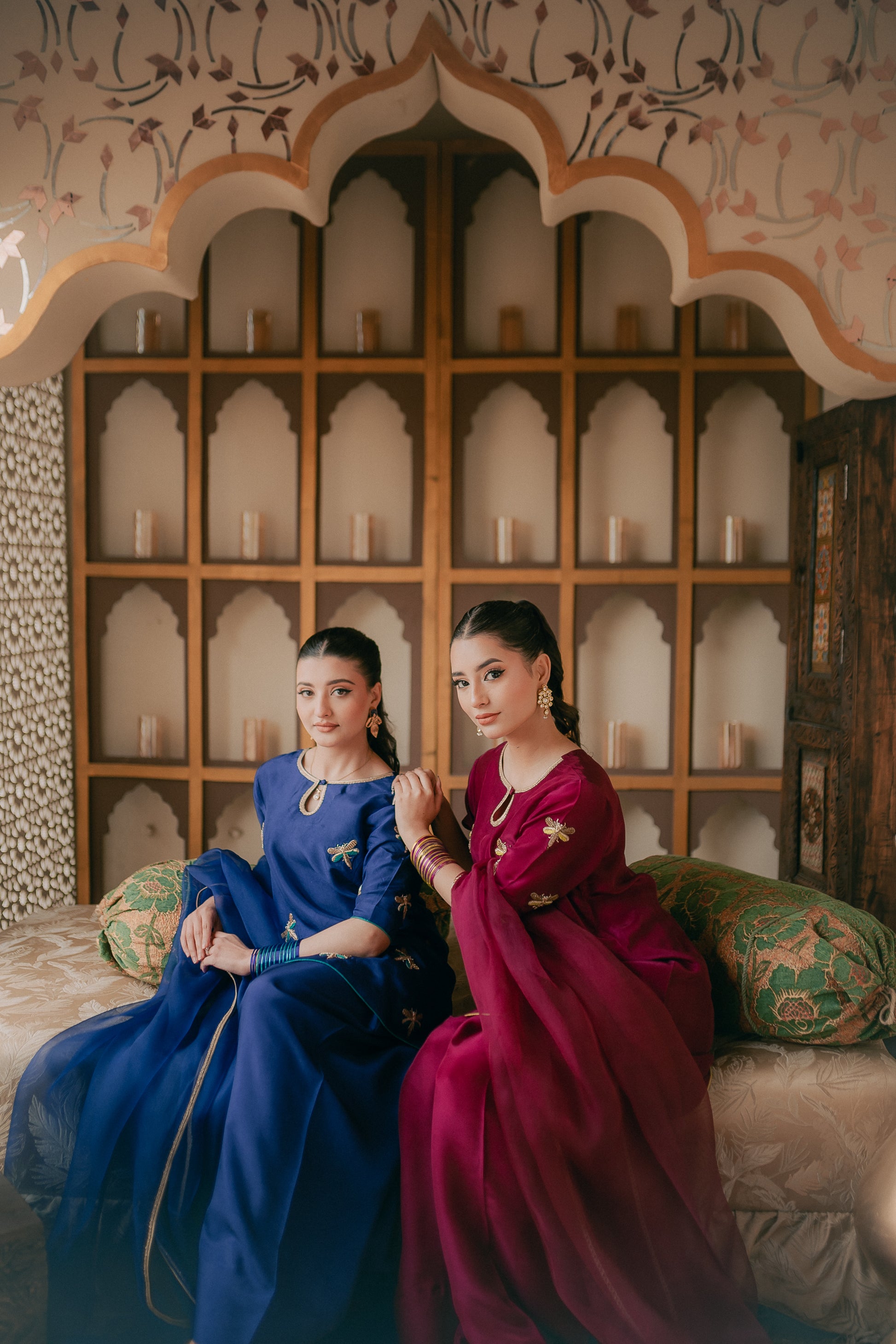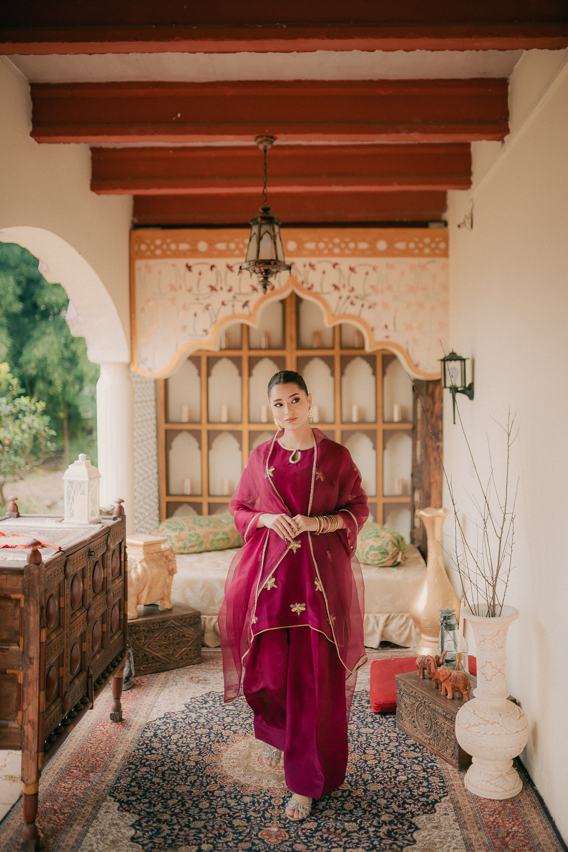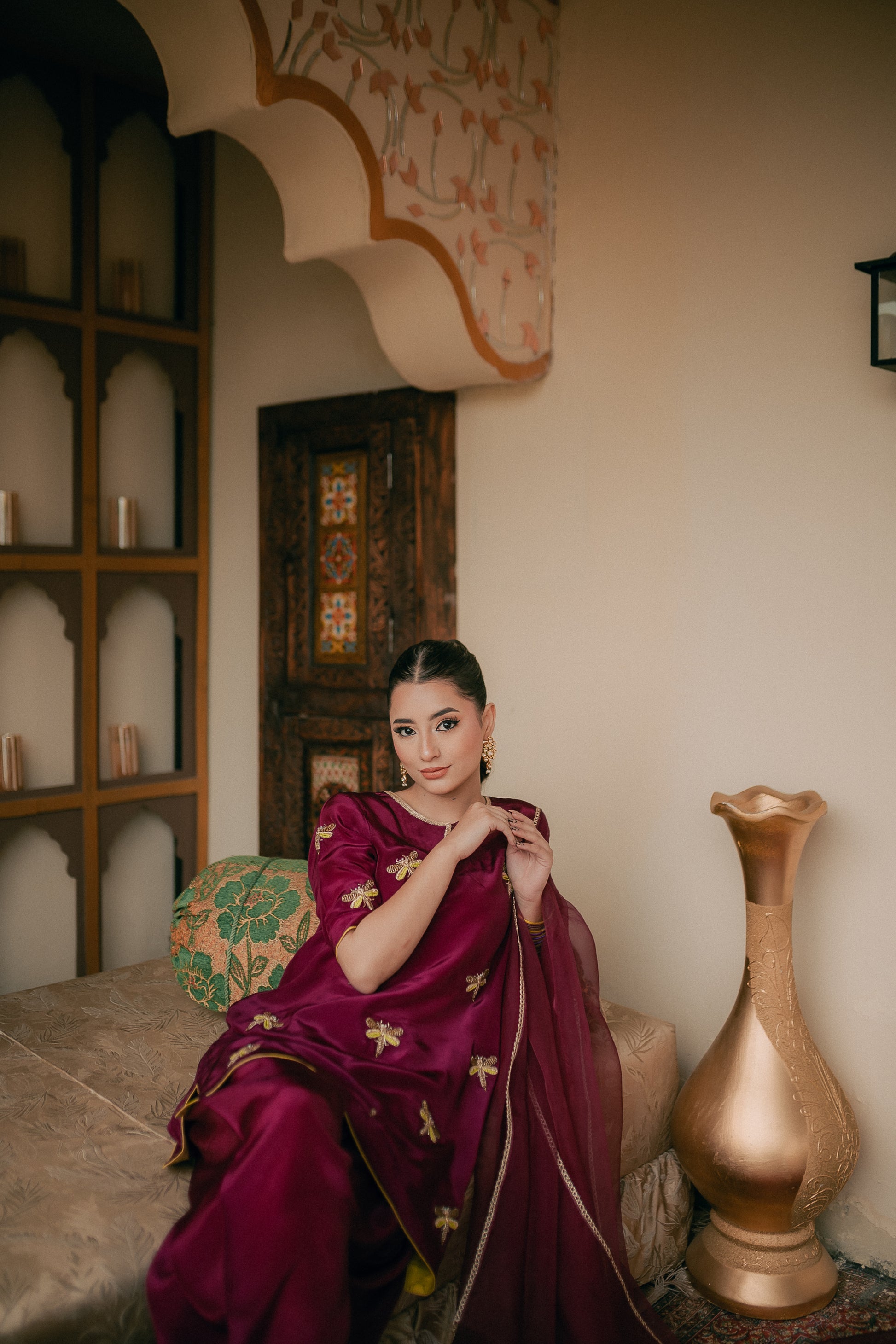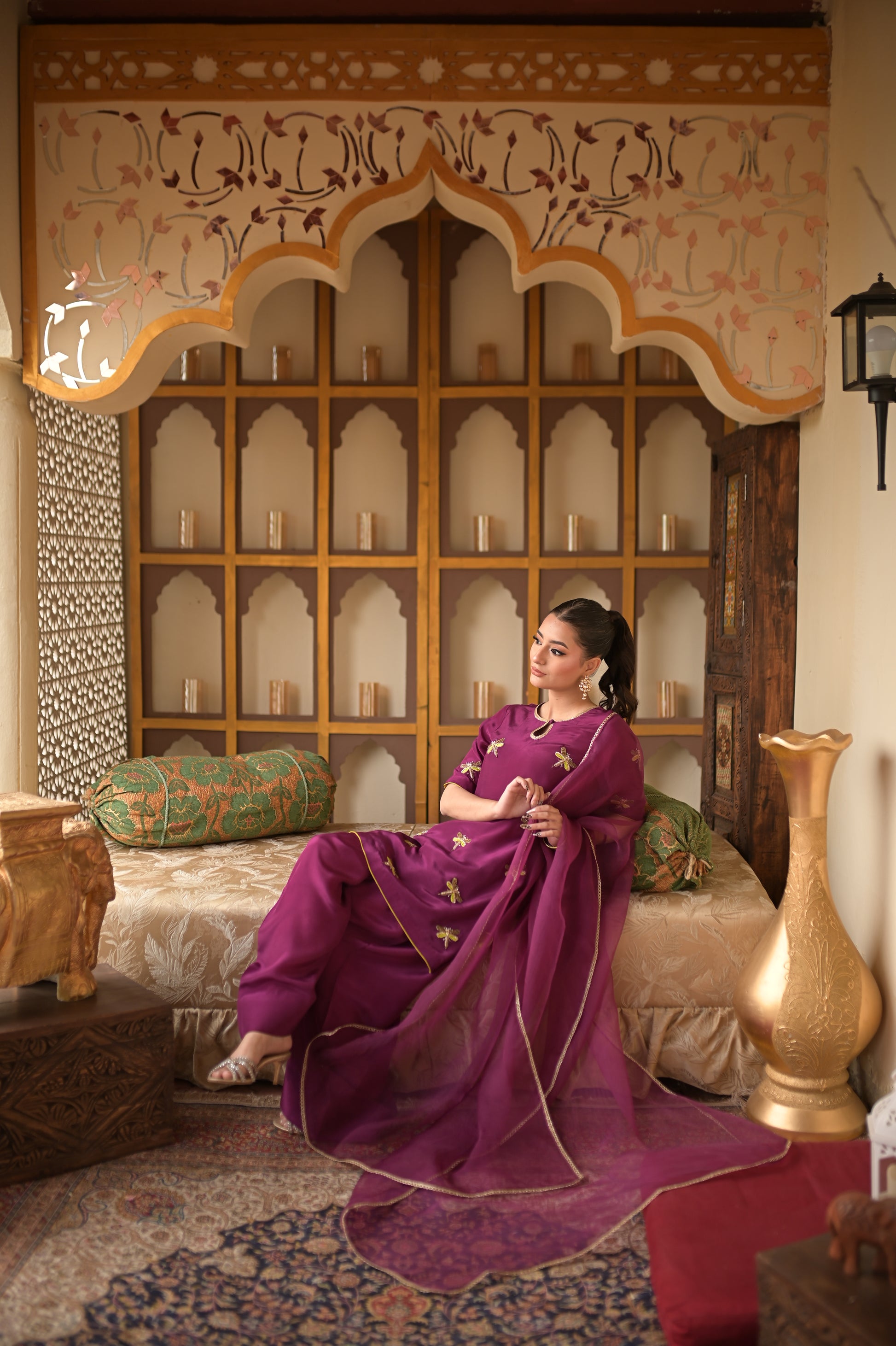 An opulent amethyst farshi silhouette adorned with intricate hand-embroidered dragonflies, paired with a soft, flowing organza dupatta.