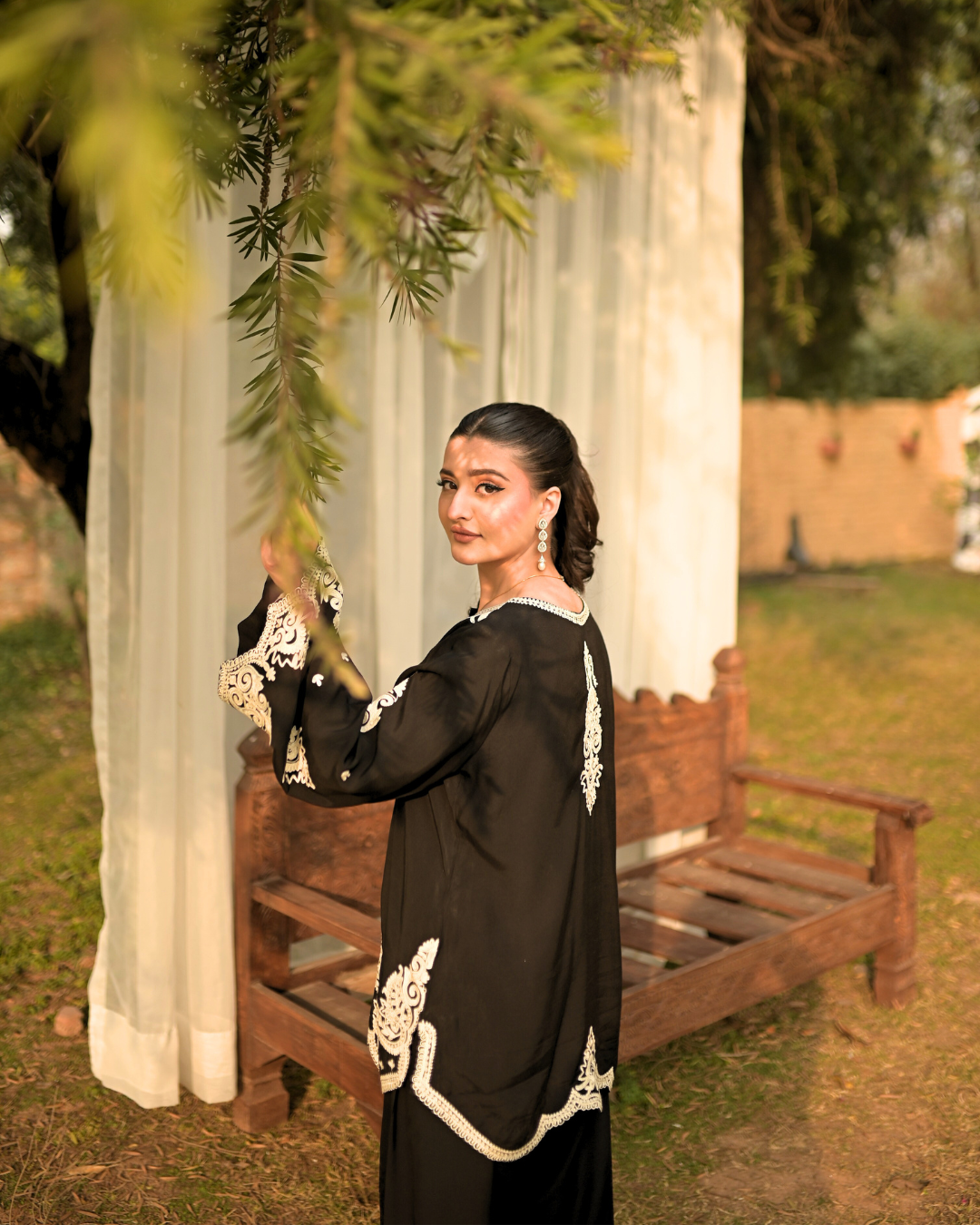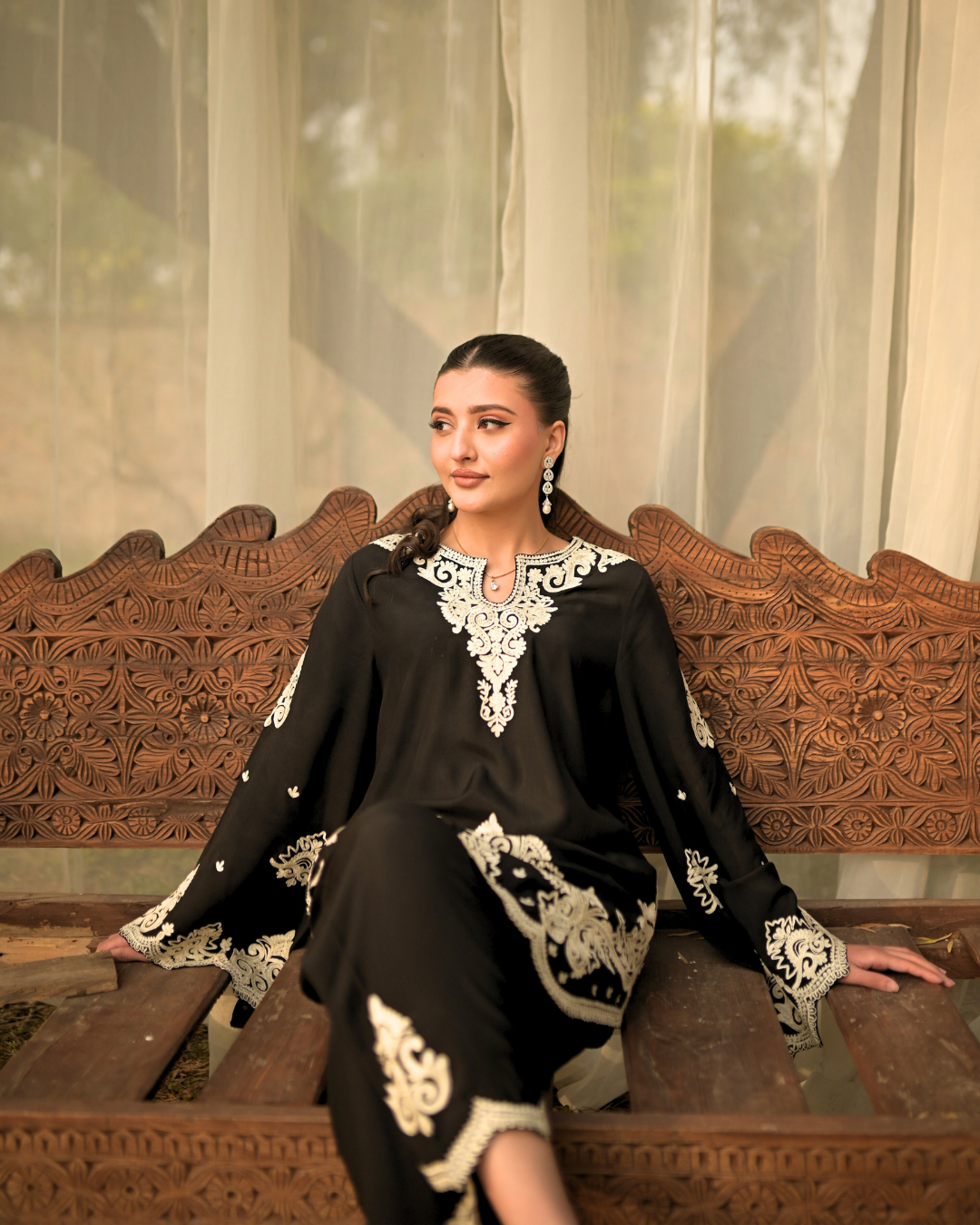 A classic black silky linen ensemble that speaks of understated luxury and timeless grace. The shirt and tapered shalwar are adorned with intricate white dori embroidery, creating a striking contrast against the deep black canvas. Designed with flowing wide sleeves for effortless movement and refined drama, this ensemble embodies modern sophistication rooted in artisanal detail.