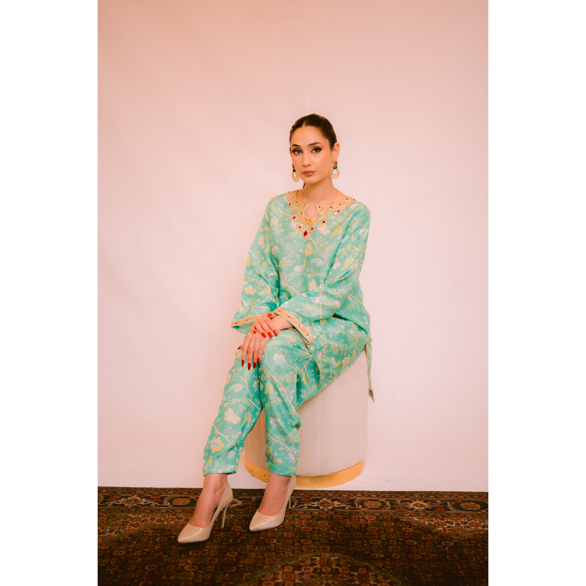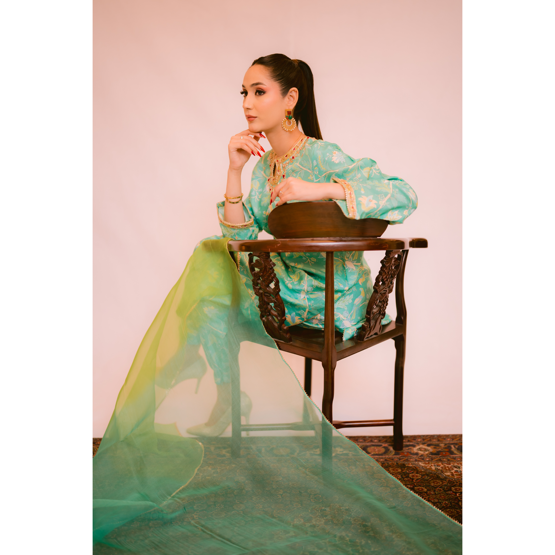 A serene mint printed raw silk ensemble that embodies effortless sophistication. The shirt and tapered shalwar are adorned with delicate hand embroidery in dabka, gota, and sequins, adding a soft shimmer to its cool, refreshing tone. Paired with a gradient organza dupatta flowing in hues of mint and lime — Celeste captures the essence of refined elegance and understated charm.